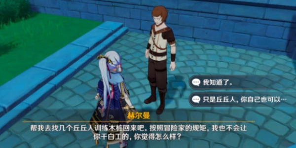2.然后按照任务指引与NPC赫尔曼对话。从对话中,你了解到你需要找到一根木桩。