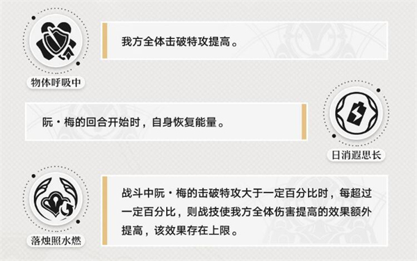 注:【破梅花】在敌方目标试图从破弱点状态恢复时触发,延长目标破弱点状态并延迟行动,并造成基于阮梅冰属性破伤伤害的破伤伤害。
