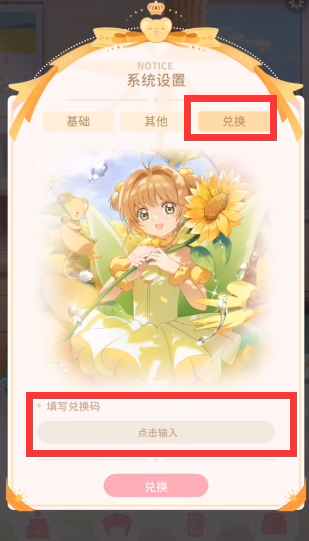 3、然后在系统设置界面,选择【兑换】区域,输入上面的兑换码即可获得福利。