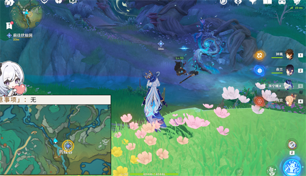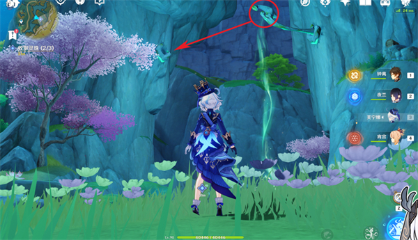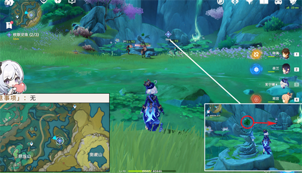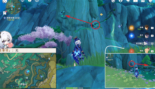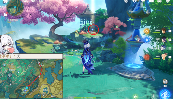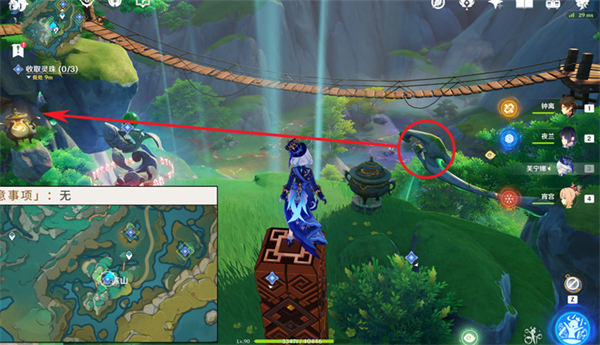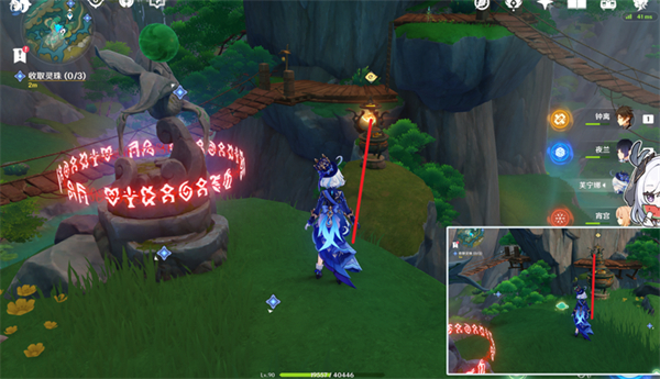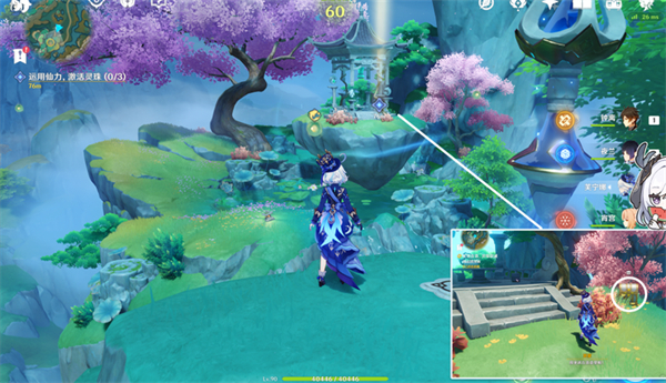 11.从石板上收集仙力,按照向导前往玄炼山,将水滴飞到山顶的凉亭。需要完成解密才能收集灵珠。