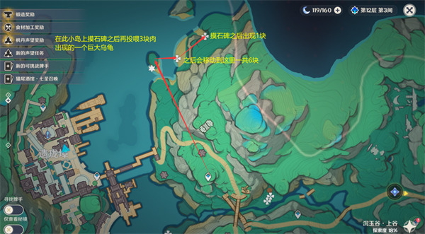 地点:先去异龙港右上方的小岛,与石碑互动,喂3块肉。走到另一边,你会发现6块清水玉。再往东北走,触摸石碑即可得到第七块。