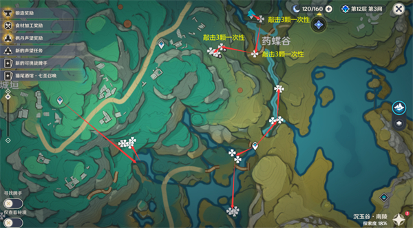 地点:药蝶谷锚点南侧有3个药罐。将它们打碎,每颗得到3 粒药丸。向西南方向去采集。