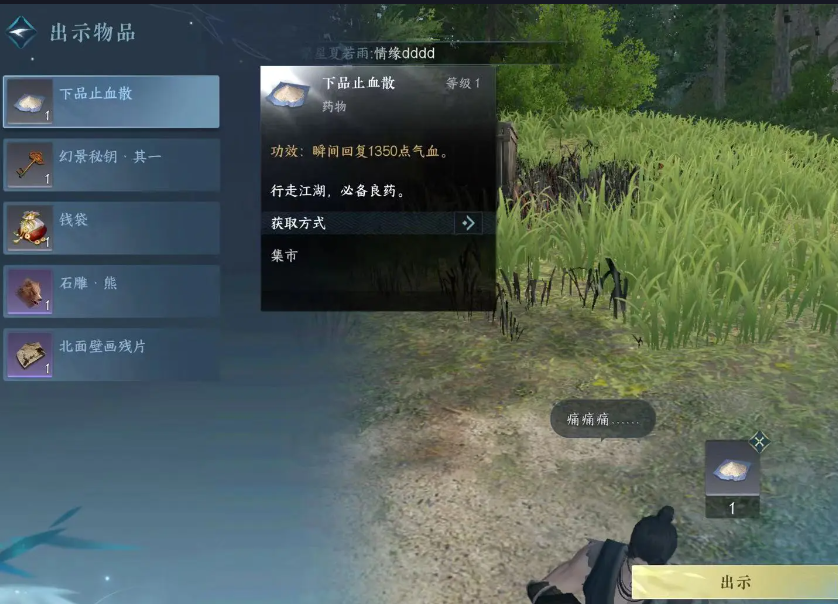 2.然后和NPC【唐扬天】对话并询问他,然后给他低品止血粉;