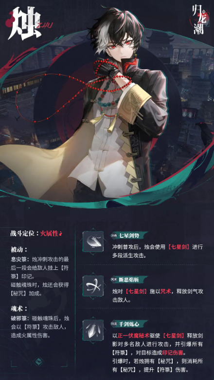 1.朱是战斗中具有火属性的角色。被动技能可以冲刺攻击敌人,在身上留下痕迹;