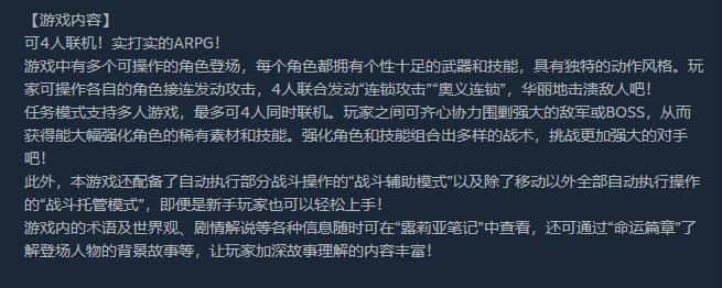 1.在Steam上的游戏类型中,可以看到这是一款可以单人玩,也可以通过在线合作玩的游戏。虽然游戏主打单人游戏,但也可以说《碧蓝幻想Relink》是一款网络游戏。
