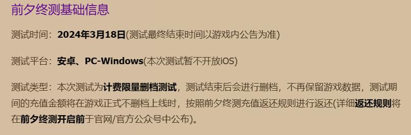 目前游戏尚未正式上线,但在最终测试时,测试平台将为【Android、PCwindows】。