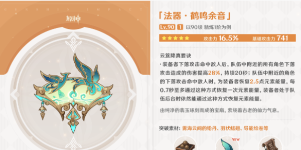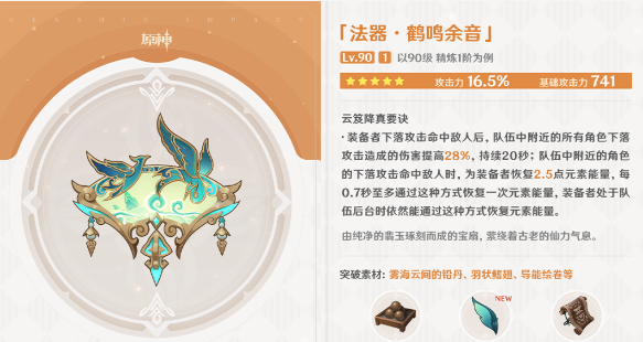 如果队伍附近的角色用坠落攻击击中敌人,装备鹤余音,将恢复2.5点元素能量;
