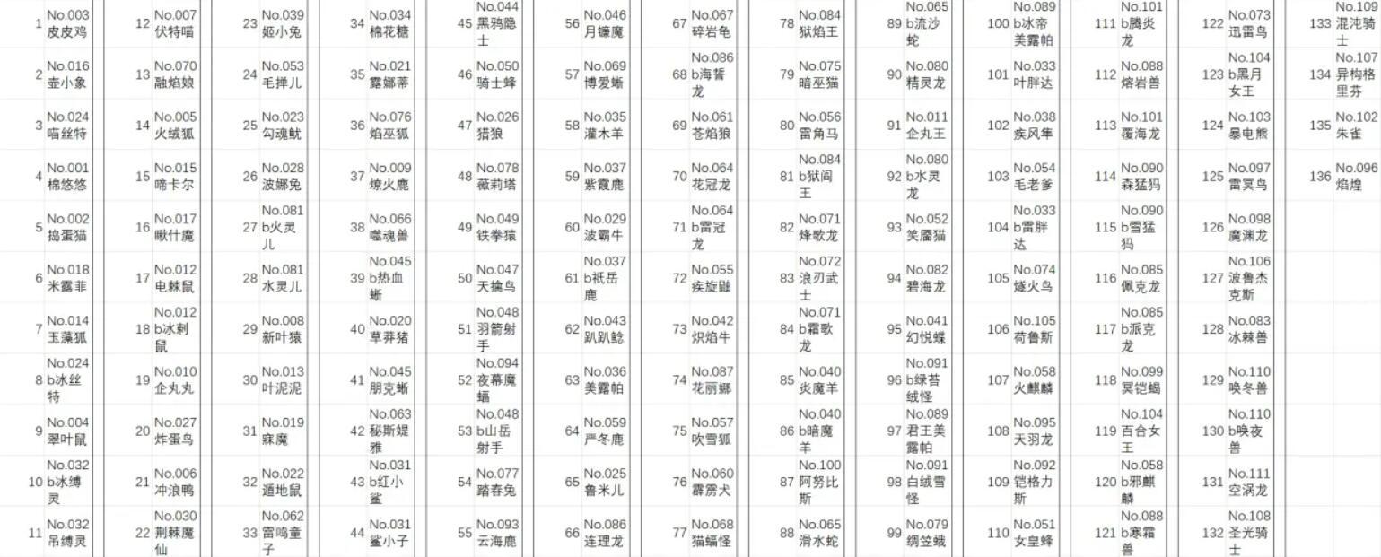 95 100 105 120 暗巫猫 385 90 100 105 90 焰巫狐 330 90 50 110 80 踏春兔 395 90 100 115 90 薇莉塔 420 100 100 100 120 绸笠蛾 390 110 90 90 100 精灵龙 360 110 80 80 90 水灵龙 370 115 80 80 95 水灵儿 310 70 100 70 70 火灵儿 310 70 100 70 70 碧海龙 380 110 70 100 100 冰棘兽 450 100 140 100 110 狱焰王 395 105 100 110 80 狱阎王 400 105 100 115 80 佩克龙 390 110 110 100 70 派克龙 405 110 110 110 75 连理龙 390 120 80 90 100 海誓龙 395 120 80 95 100 花丽娜 395 100 100 95 100 熔岩兽 435 110 100 105 120 寒霜兽 445 110 100 105 130 君王美露帕 395 120 100 85 90 冰帝美露帕 395 120 100 85 90 森猛犸 425 150 100 85 90 雪猛犸 425 150 100 85 90 白绒雪怪 420 140 100 80 100 绿苔绒怪 430 140 100 80 110 铠格力斯 440 120 100 100 120 云海鹿 420 110 110 110 90 夜幕魔蝠 415 100 100 105 110 天羽龙 405 105 100 100 100 焰煌 495 100 150 125 120 雷冥鸟 425 100 100 125 100 魔渊龙 450 100 100 125 125 冥铠蝎 430 100 100 100 130 阿努比斯 480 120 130 130 100 覆海龙 500 130 150 120 100 腾炎龙 510 130 150 130 100 朱雀 430 120 100 105 105 清雀 435 125 100 105 105 暴电熊 425 105 120 100 100 百合女王 425 110 100 110 105 黑月女王 435 110 100 110 115 荷鲁斯 415 100 100 105 110 波鲁杰克斯 430 100 100 130 100 异构格里芬 510 120 130 120 140 圣光骑士 505 130 110 120 145 混沌骑士 495 130 100 145 120 唤冬兽 500 140 100 140 120 唤夜兽 515 140 100 140 135 空涡龙 460 110 100 140 110 详细介绍 1、大多数帕鲁配种的产物是由两只配种帕鲁的隐藏种族值决定的,如下图所示的参考值
