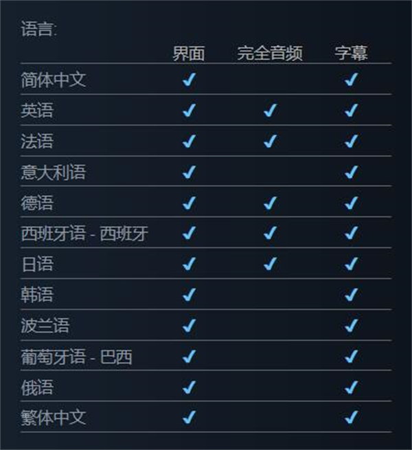 支持的语言:简体中文、英语、法语、意大利语、德语、西班牙语- 西班牙语、日语、韩语、波兰语、葡萄牙语- 巴西、俄语、繁体中文。