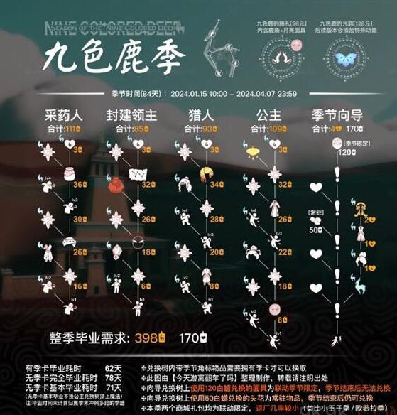 光遇玩家需要了解游戏中新九色鹿季节兑换图的内容。他们在获得它时将需要它。这是非常重要的。那么小编就来介绍一下九色鹿吧。鹿季所有物品的兑换表。 光遇九色鹿季节兑换图展示九色鹿季节所有物品兑换图