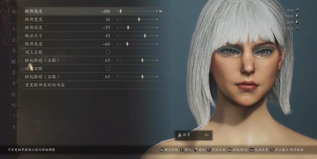 眼睛:31,上下位置:1,间隔:2,大小:3,眼睛颜色:倒数第四行第五个