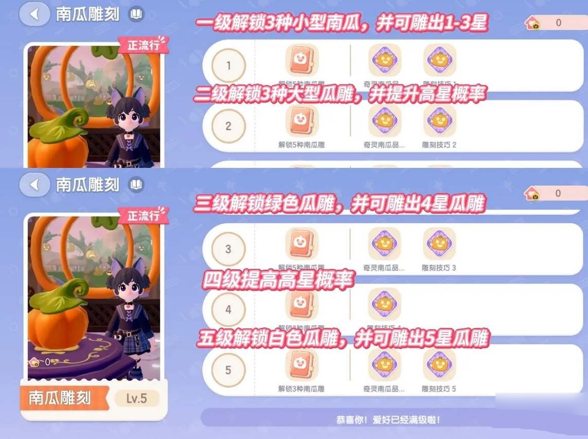 南瓜雕刻等级和图鉴:1级:解锁3种颜色(橙色、黄色、棕色)的小瓜雕、1-3星瓜雕和5张插图。