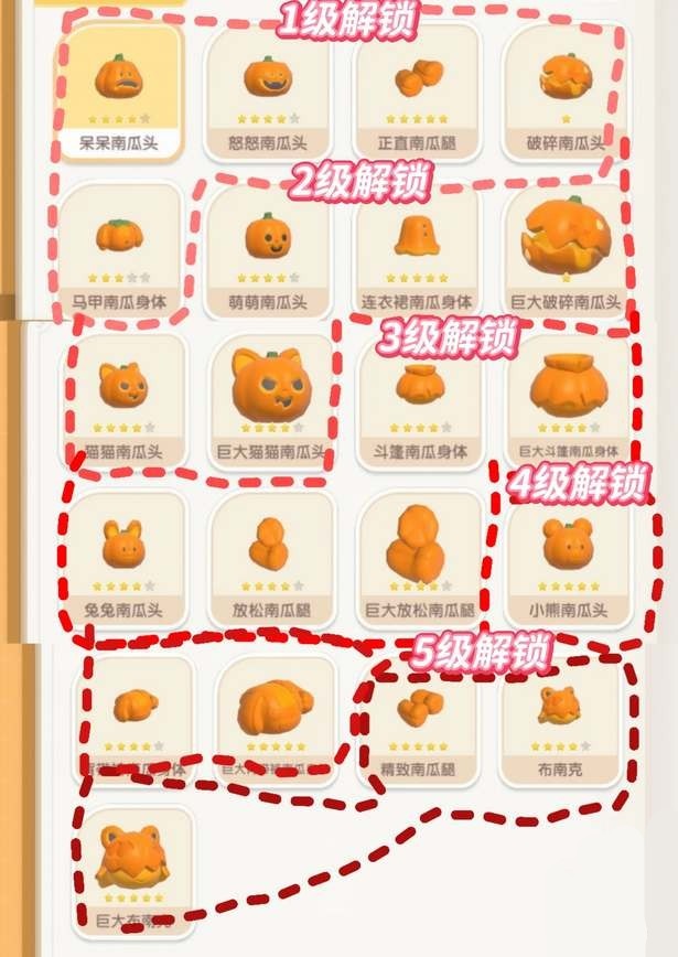 第二级:可爱南瓜头、猫南瓜头、装扮南瓜身。