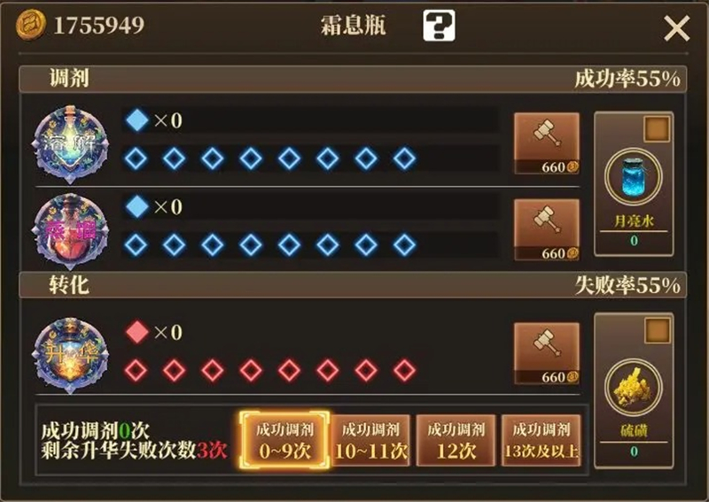 使用“硫”可以将下一个过程的基本概率降低10,不超过25,并且不能与“月亮水”同时使用;