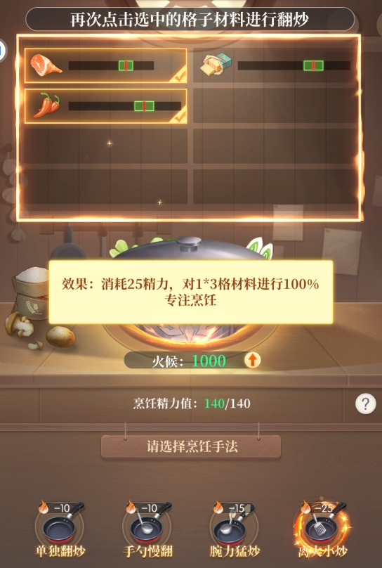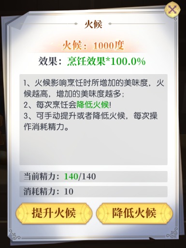 每种烹饪都消耗能量,调节热量也会消耗能量。因此,需要在精力耗尽之前进行烹饪,否则您将无法继续改善美味或更改热量。