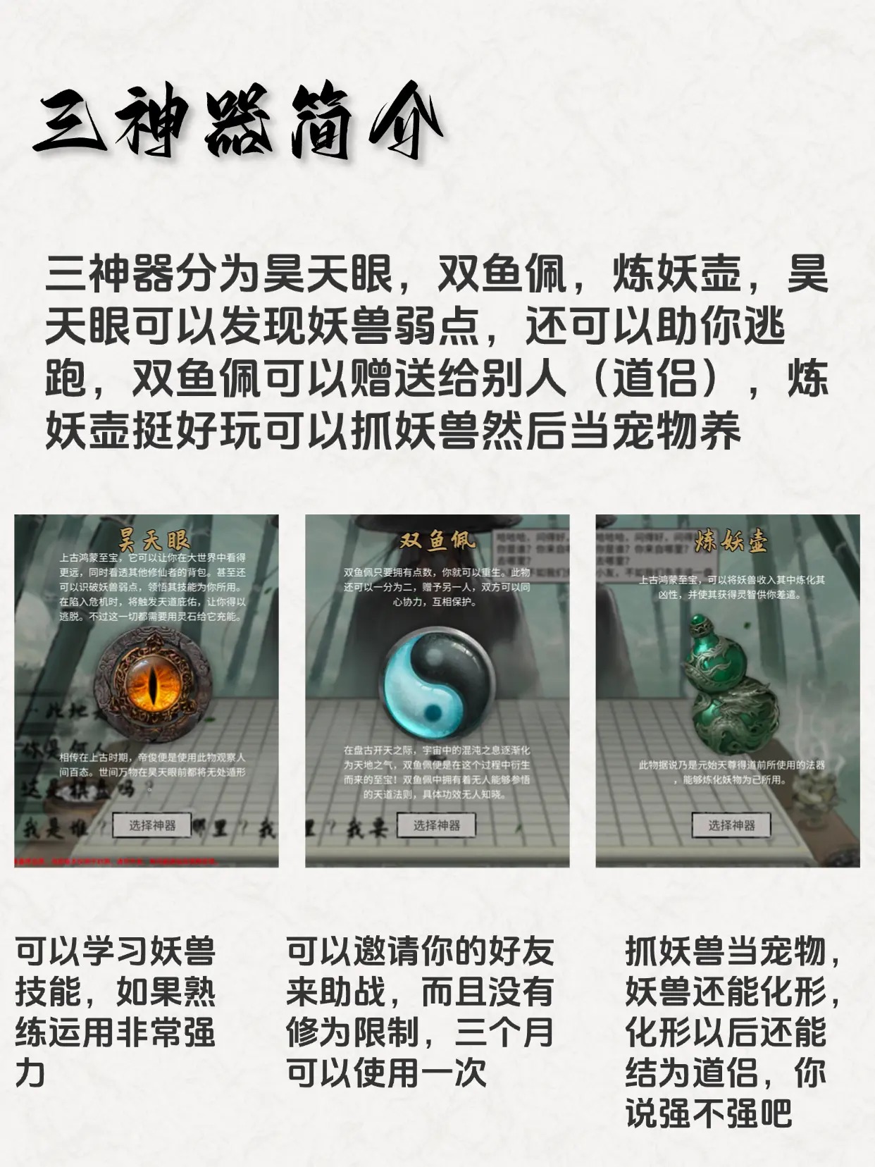 最后,让我们介绍这三个工件。这三个文物分为Haotian眼睛,双鱼座吊坠和恶魔炼油锅。 Haotian的眼睛可以发现怪物的弱点,并帮助您逃脱。可以将双鱼座吊坠交给其他人(Tao夫妇)。恶魔炼油锅很有趣,可以抓住怪物,然后作为宠物保存。甚至宠物也可以转变为道教同伴。