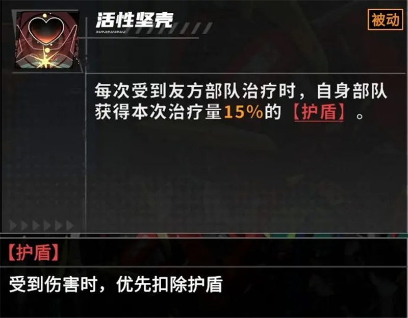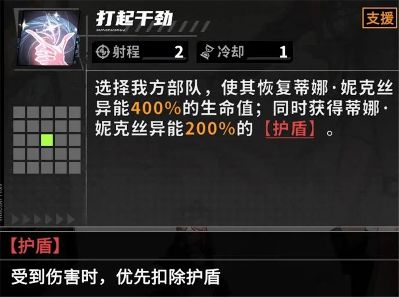 我相信每个人都注意到了上面的第二个技能。无论是血液恢复还是增加盾牌,它都与超级能力值有关。希尔德身体的第二技能可以最大化尼克斯的能力值。 NIX的能力值越高,您可以添加的盾牌越厚