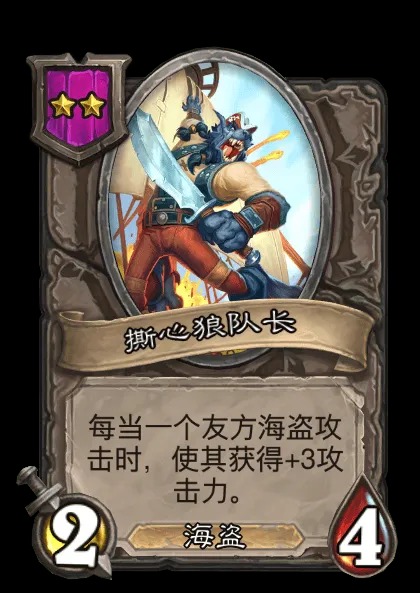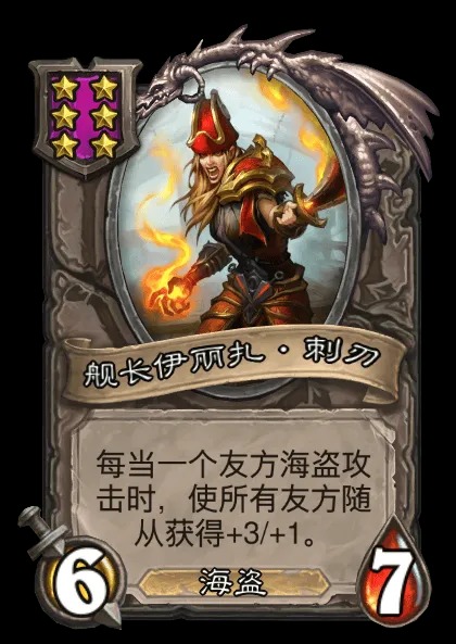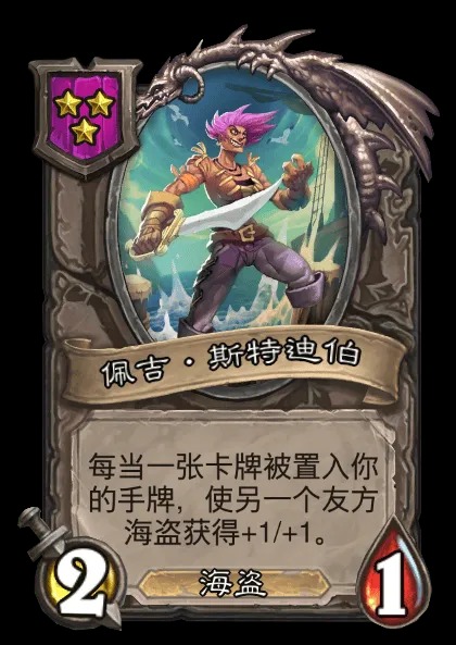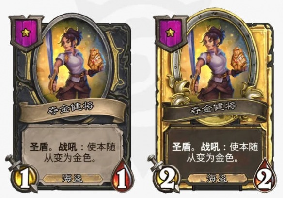 每当您获得海盗卡,给其他奴才+1/+1时,金奴才会更改为+2/+2。