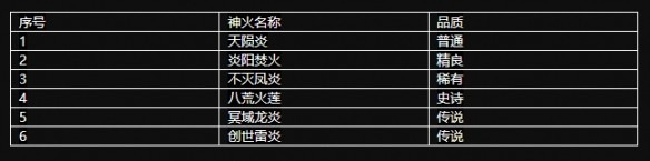 神的火有五种特质:普通(白色),优秀(绿色),稀有(蓝色),史诗(紫色)和传奇(橙色)。质量越高,属性越好。