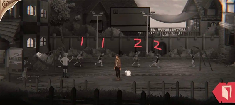 足球场分为白人队,第1号黑人队,白人队2号,黑人队2和双方的守门员。从主角(父亲)没有干扰他们的事实开始,如果允许怀特2踢球然后允许黑人队守门员扑救球以拯救球,他将在1号射击并调整位置,以便黑色1可以悬挂金钩,然后将足球踢入教学建筑的一楼。但是,如果您在White 2的射门和守门员的扑救之间,请让Black 2站在White 2后面,在进行空踢之后(如图所示),然后让守门员拯救球,一个大脚足球将踢到教学大楼的三楼。