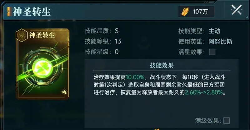核心技能“神圣的转世”改善了愈合效果,并每10秒选择自己和周围的军团中最低的耐用性团队进行康复。技能效应非常简单,主要是提供康复。