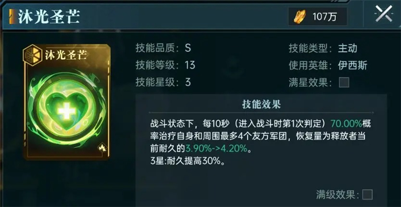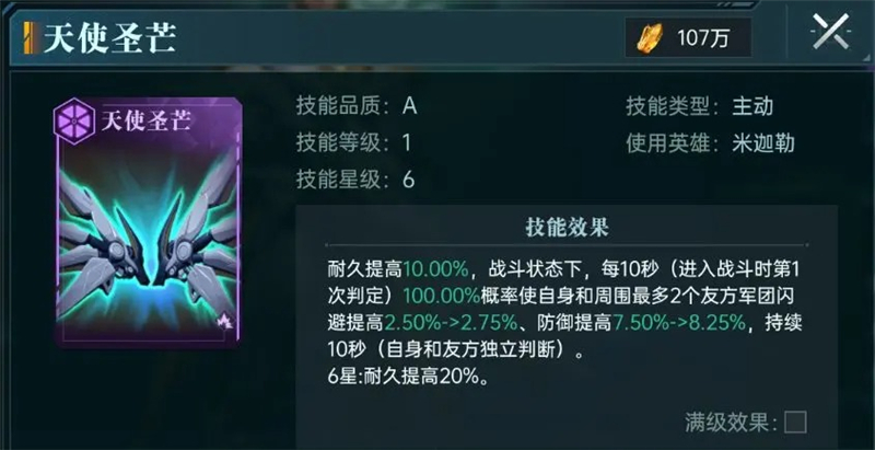 核心技能“天使圣光”提高了其耐用性,同时每10秒就增加了自己和周围的军团道奇率和防御属性。因为它是紫色的英雄,所以很容易充满星星。完整的星星之后,概率将增加到100,这意味着可以稳定地提供属性奖金。