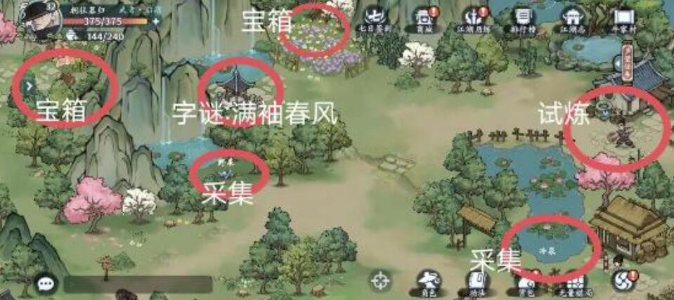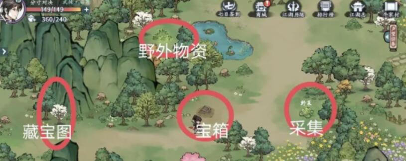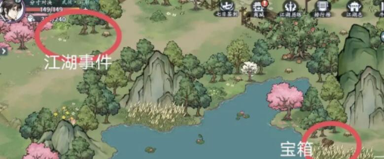 总共有九个江湖事件、四个野外补给、九个宝箱事件、五个收集事件、两个试炼挑战、两个藏宝图。