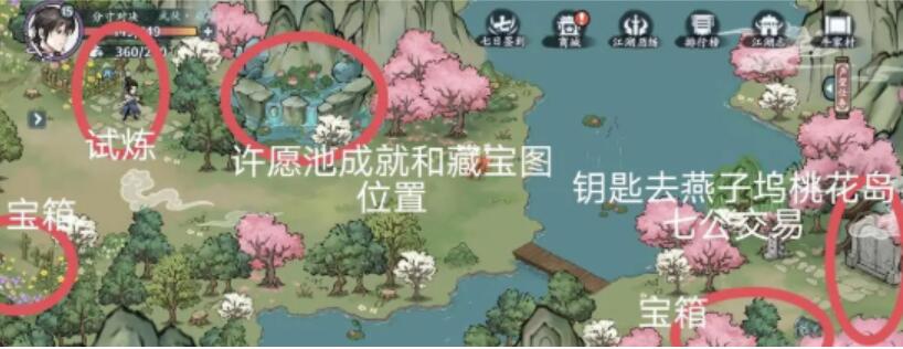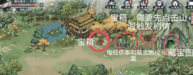5. 6号、7号宝箱和2号藏宝图位置如下图。点击洞穴即可触发宝箱;